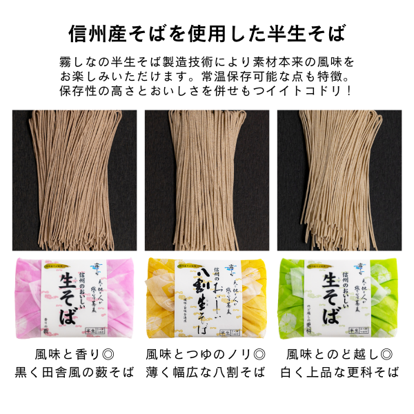 長野県産そばを使用した半生そば。蕎麦の殻部分を取り除き、内側の実·香りの強い甘皮部分をそば粉